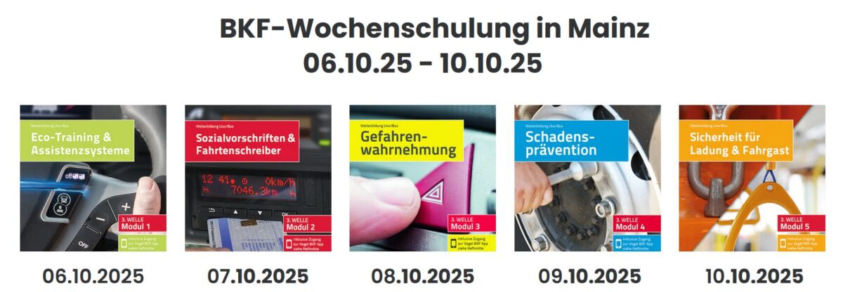 Ergänzend zur beschleunigten Grundqualifikation brauchen LKW- und Busfahrer alle 5 Jahre eine Weiterbildung nach dem BKF-Gesetz. Die Dauer dieser regelmäßigen Weiterbildung beträgt 5 x 7 Stunden und kann entweder im Block oder verteilt auf Wochentage durchgeführt werden.